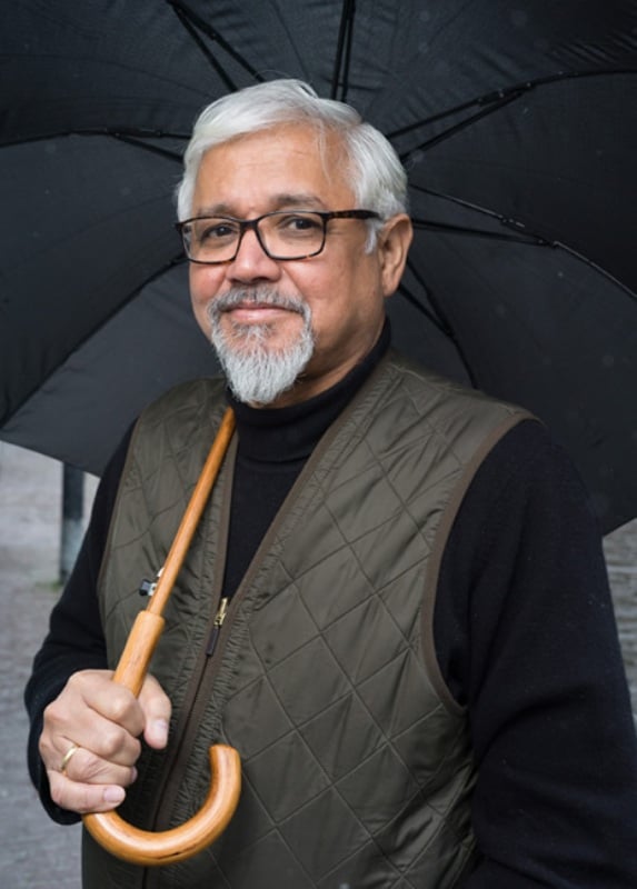 Amitav Ghosh while sitting in his library